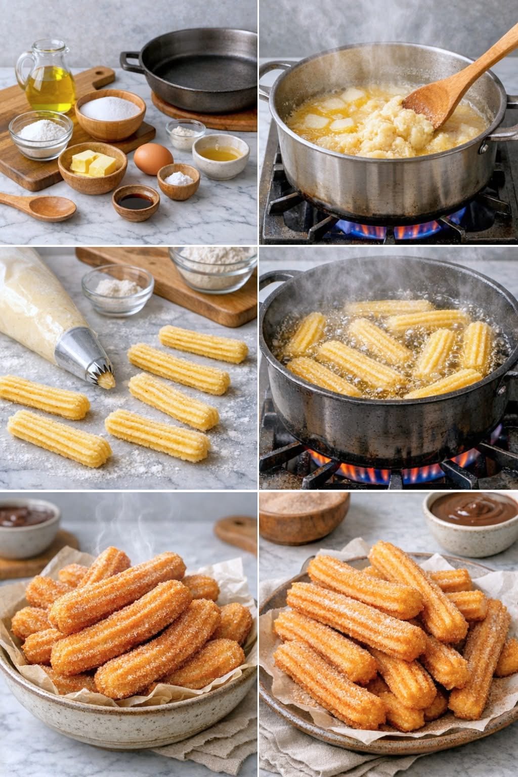 Fríe los churros por tandas hasta que estén dorados por fuera, aproximadamente 3–4 minutos.