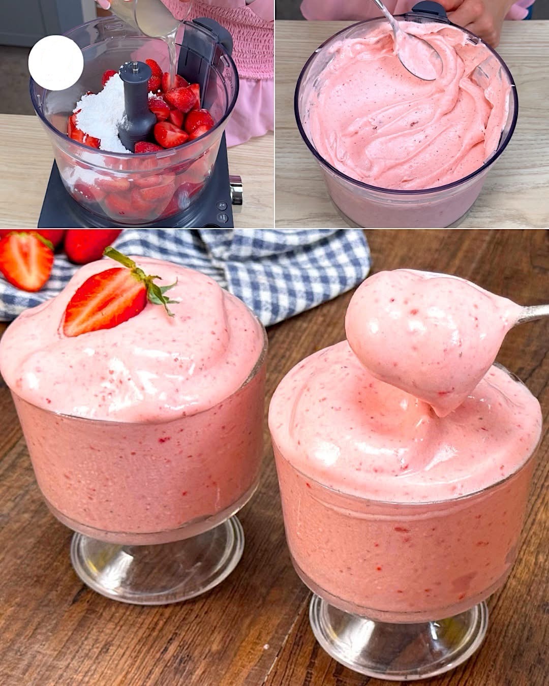 Cremoso, esponjoso y ligero, el spumone es ideal para servir al final de una comida, después de una cena con amigos o como merienda en los días de verano. La única regla para un resultado óptimo, además de elegir las fresas más rojas, jugosas y dulces, es usar solo ingredientes y utensilios muy fríos, directamente del refrigerador, incluyendo vasos o tazas individuales y las cuchillas de la procesadora de alimentos.