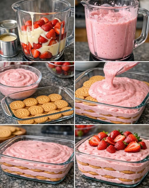Licúa las fresas junto con la leche condensada y la leche evaporada hasta obtener una mezcla cremosa y uniforme.