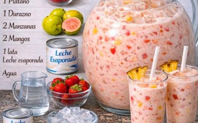 Ingredientes: 12 fresas 6 guayabas 1 plátano 1 durazno 2 manzanas 2 mangos 1½ litros de agua (para licuar) ½…