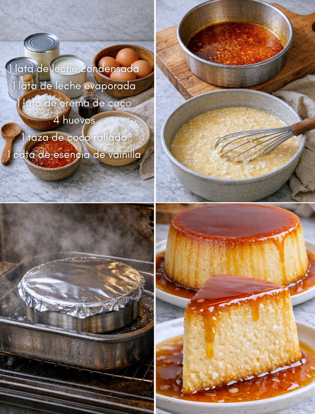 En un bowl grande, bate los huevos. Agrega la leche condensada, la leche evaporada, la crema de coco, la vainilla y el coco rallado.