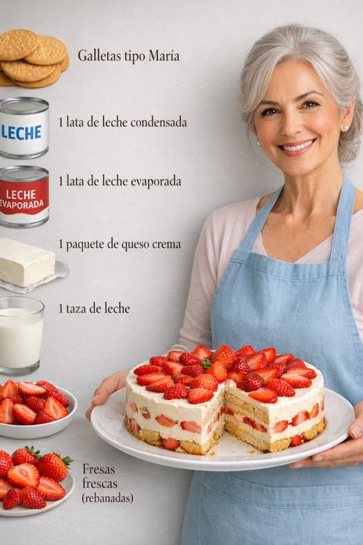 6. Repite las capas (galletas, crema y fresas) hasta terminar los ingredientes, procurando finalizar con crema.