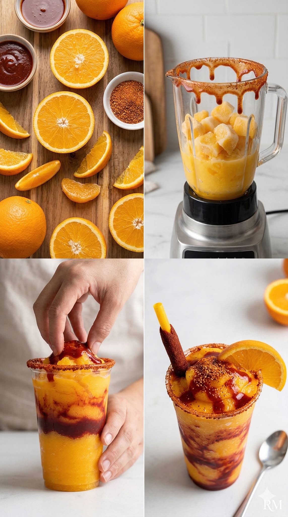 En cada vasito coloca cubitos de naranja, un chorrito de chamoy y una pizca de Tajín.