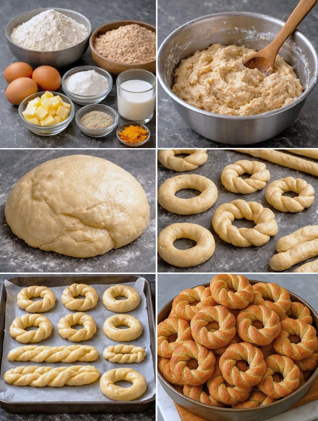 Divide la masa en porciones pequeñas, haz tiras y forma las roscas trenzadas o anilladas a tu gusto.