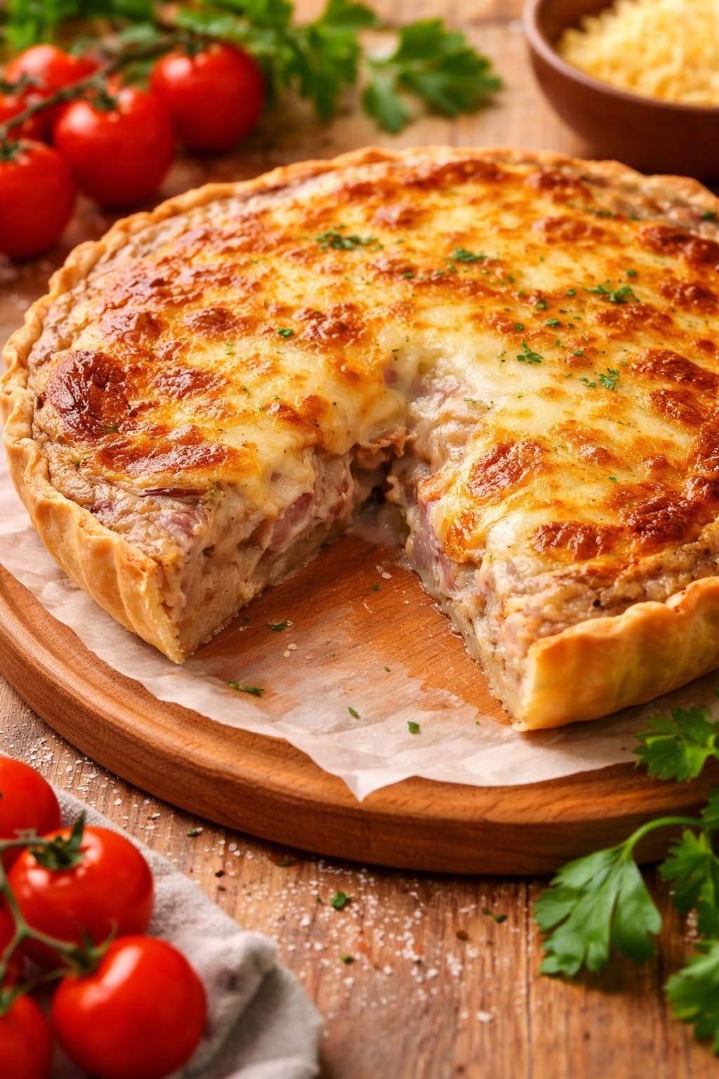 Sacamos la quiche del horno, la desmoldamos, y se sirve templada o fría.