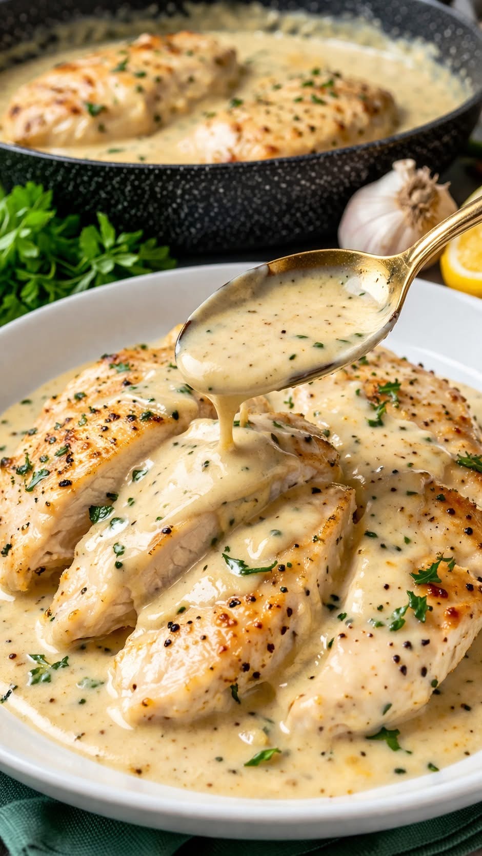 Este pollo en salsa de nata, ajo y parmesano es la cena cremosa y reconfortante que se prepara en pocos pasos y conquista a todos. La carne queda jugosa y dorada, bañada en una salsa sedosa con el punto salino del parmesano y el aroma profundo del ajo. Perfecto para mojar pan o acompañar con pasta, arroz o puré, es un plato que luce de domingo pero se cocina en cualquier día de la semana. Con trucos sencillos para evitar que la nata se corte y lograr una salsa brillante, tendrás un resultado de restaurante sin complicaciones.