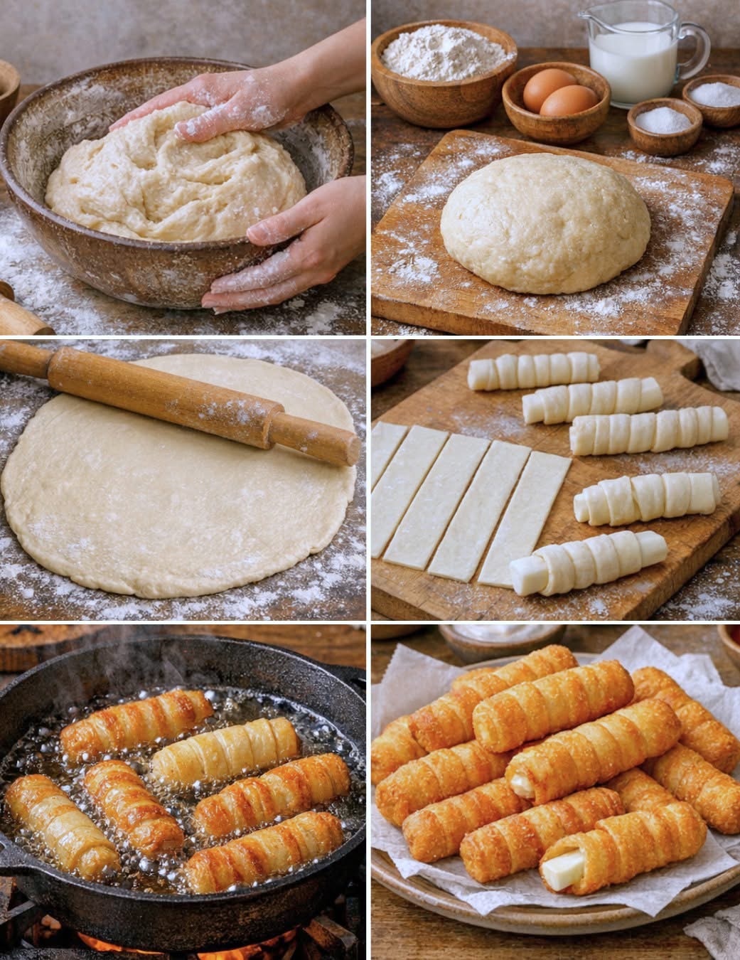 Divide la masa en porciones y estírala con un rodillo hasta lograr un grosor de 2 a 3 mm. Corta tiras largas de aproximadamente 1.5 cm de ancho. Envuelve cada tira alrededor de una barra de queso de 7 a 8 cm de largo, solapando bien para que no se salga el queso al freír.