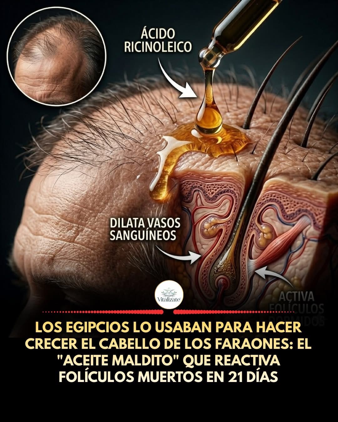 El Aceite de Ricino contiene un ácido graso único en la naturaleza llamado Ácido Ricinoleico — representa el 90% de su composición. Este compuesto tiene una capacidad que ningún otro aceite vegetal posee: penetra hasta la segunda capa de la piel y dilata los vasos sanguíneos alrededor del folículo piloso. Es como abrir una represa que llevaba años cerrada: de repente, el folículo recibe un torrente de oxígeno, queratina y minerales que no llegaban.