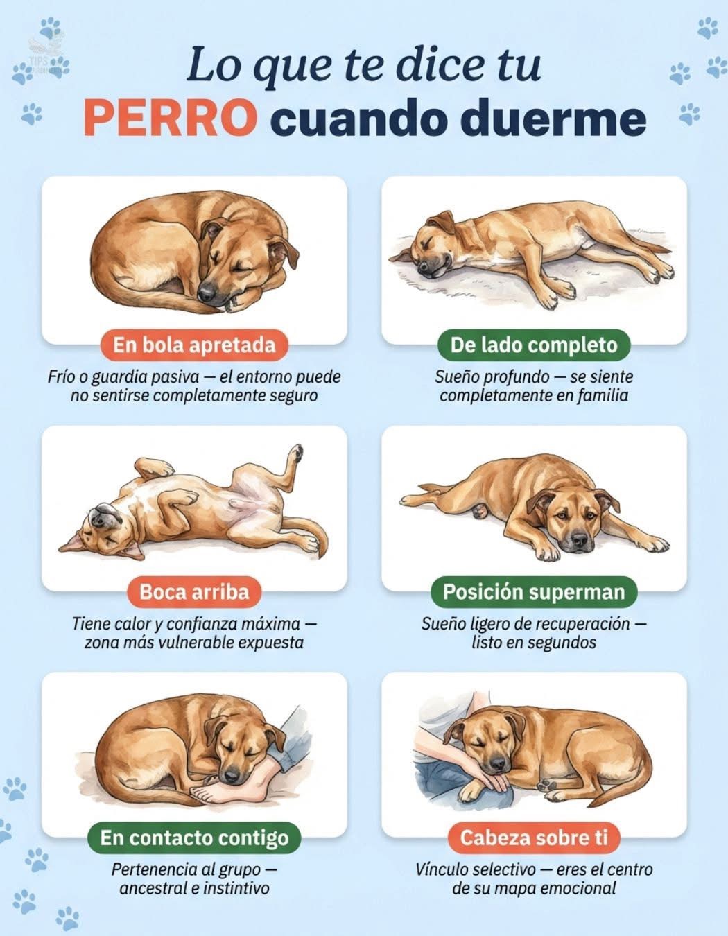Enroscado junto a ti o en contacto físico: calor compartido y pertenencia al grupo. Esta es la postura ancestral de descanso en manada — no es solo afecto, es identidad. El perro que busca contacto físico para dormir te está incluyendo en su grupo de referencia.